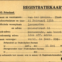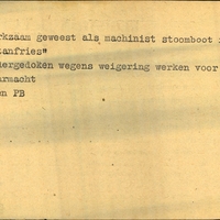 Achterkant bijzonderheden: Duik-adres: Eernewoude, aan boord. - Toekomstig adres: idem off. adres - - Naam verzorger: verkl. de Boer. NBS. - Behandeld op Onderduikers-bureau te Lwd. den 11 Mei 1945. - Ondergedoken wegens weigering werken voor Wehrmacht. - Achterkant beroep: werkzaam geweest als machinist - Achterkant naam werkgever: stoomboot reederij "Stanfries