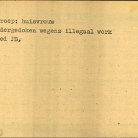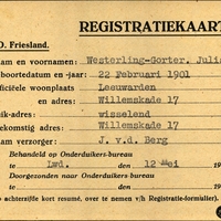 Achterkant bijzonderheden: Gehuwd: Julia Cath. Westerling-Gorter. - - Duik-adres: wisselend. - Toekomstig adres: Willemskade 17 Leeuwarden. - Achterkant beroep: Huisvrouw