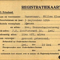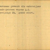 Achterkant bijzonderheden: Toekomstig adres: idem off. adres (Rhenen, Nwe. Veenendaalscheweg 39) - - Behandeld op Onderduikers-bureau te Lwd. den 19 Mei 1945. - goede stkrt. - Achterkant beroep: werkzaam geweest als onderwijzer