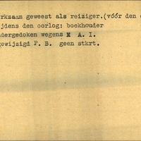 Achterkant bijzonderheden: Werkzaam geweest als reiziger (vóór den oorl.) tijdens den oorlog: boekhouder - Achterkant beroep: reiziger boekhouder