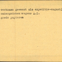 Achterkant bijzonderheden: Toekomstig adres: Leeuwarden, Bijenhofstraat 27 - - Behandeld op Onderduikers-bureau te Lwd. den 5 Mei 1945. - Achterkant beroep: werkzaam geweest als expeditie-magazijnchef