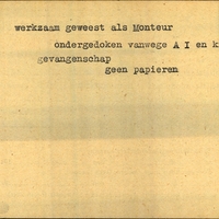 Achterkant bijzonderheden: Ook ondergedoken wegens krijgsgevangenschap. - Achterkant beroep: Monteur