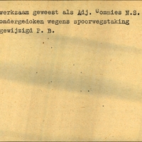 Achterkant bijzonderheden: Ondergedoken wegens spoorwegstaking. - Toekomstig adres: idem off. adres (Leeuwarden, Gerard Terborchstraat 58) - - Naamsvermelding duik-adres: de Vries - Behandeld op Onderduikers-bureau te Lwd. den 2 Mei 1945. - Achterkant beroep: werkzaam geweest als Adj. Commies N.S. - Achterkant naam werkgever: N.S.