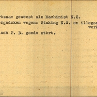 Achterkant bijzonderheden: ondergedoken wegens Staking N.S. en illegaal werk valsch PB, goede stkrt. - Achterkant beroep: Machinist - Achterkant naam werkgever: N.S.