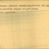Achterkant bijzonderheden: Werkzaam geweest alsrijtuigpoetser Ned. Sp. - Ondergedoken wegens kr.gev.schap. - Goede papieren. - Achterkant beroep: Rijtuigpoetser - Achterkant naam werkgever: Ned. Sp.