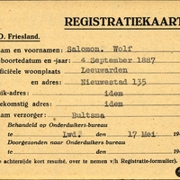 Achterkant bijzonderheden: Toekomstig adres: idem - - Behandeld op Onderduikers-bureau te Lwd. den 17 Mei 1945. - valsch PB, geen stkrt. - Achterkant beroep: winkelier in mode-artikelen