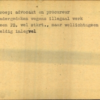 Achterkant bijzonderheden: Duik-adres: wisselend. - Toekomstig adres: Willemskade 17 Leeuwarden. Wel stkrt, maar wellicht geen geldig inlegvel. - Achterkant beroep: Advocaat en procureur - Achterkant naam werkgever: -