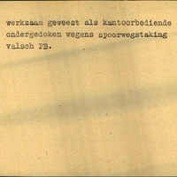 Achterkant bijzonderheden: Spoorwegstaking. - Achterkant beroep: Kantoorbediende - Achterkant naam werkgever: G&L