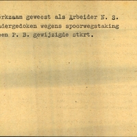 Achterkant bijzonderheden: Toekomstig adres: Leeuwarden, Oosterbuurt 23 - - Behandeld op Onderduikers-bureau te Lwd. den 3 Mei 1945. - gewijzigde stkrt. - Achterkant beroep: werkzaam geweest als Arbeider N.S. - Achterkant naam werkgever: N.S.