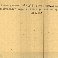 Achterkant bijzonderheden: Duikadres: p/a D. Bergsma - Ondergedoken wegens: "De S.D. Zat me op de hielen - Achterkant beroep: Adj. Comm. Gew. Arb. bureau