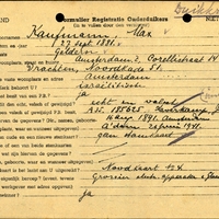 Bijzondere opmerkingen: Bezat naast het echte ook een vals persoonsbewijs: A35 185625 Haverkamp, Johannes, geboren 16-08-1891 Amsterdam. Uitgegeven 26 juni 1941. Bezit geen stamkaart, laatste bonkaart noodkaart nr 4. Ontving tot eind december fl.90,- steun per maand.