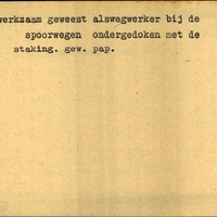 Achterkant bijzonderheden: Spoorwegstaking. - Achterkant beroep: wegwerker - Achterkant naam werkgever: spoorwegen