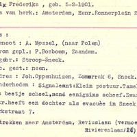 Bijzonderheden - Signalement: Klein postuur. - Tamelijk dik, ziet een beetje scheel, mond eenigzins scheef. - Zwart haar. - Betr. heeft een dochter als evacuée in Sneek, p.a. Koerten-Parkstraat 7. - Vertrokken naar Amsterdam, Reviuslaan (vermoedelijk Rivierenlaan 22)