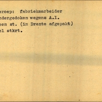 Achterkant bijzonderheden: Geen st. (in Drente afgepakt). - Wel stkrt. - Achterkant beroep: Fabrieksarbeider - Achterkant naam werkgever: -