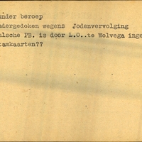 Achterkant bijzonderheden: Vermelding bij Duik-adres: P. de Weert. - Langelille. Munnikenburen - - Valsche PB. is door L.O.. te Wolvega ingenomen stamkaarten?? - Achterkant beroep: zonder beroep