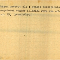 Achterkant bijzonderheden: Naam echtgenoot; "Hofenk" - Werkzaam geweest als: zonder beroep(huisvrouw) - Ondergedoken wegens illegaal werk van echtgenoot. - valsch PB, geennstkrt. - Achterkant beroep: huisvrouw