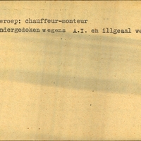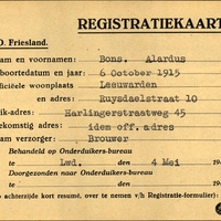 Achterkant bijzonderheden: Toekomstig adres: idem off. adres - - Behandeld op Onderduikers-bureau te Lwd. den 4 Mei 1945. - Ondergedoken wegens A.I. en illgeaal werk - Achterkant beroep: chauffeur-monteur