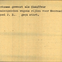Achterkant bijzonderheden: ondergedoken wegens rijden voor Weermacht - - goed P. B. geen stkrt. - Achterkant beroep: Chauffeur - Achterkant naam werkgever: Weermacht