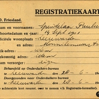Achterkant bijzonderheden: Duik-adres: idem - - Toekomstig adres: idem - Behandeld op Onderduikers-bureau te Leeuwarde den 28-6-1945. - Doorgezonden naar Onderduikers bureau te Leeuwarde den 28-6-1945.