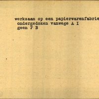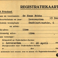 Achterkant bijzonderheden: Toekomstig adres: idem - - Behandeld op Onderduikers-bureau te Leeuwarden den 20 April 1945. - Achterkant beroep: werkzaam op een papierwarenfabriek