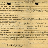 Bijzondere opmerkingen: Vals P.B, t.n.v. Jacob Simon de Vries, geb. 19 Februari 1887 te Blora N.I. uitgeg. te A'dam 9 Sept. 1941. Geen stamkaarten. - Steun was wel aangevraagd door mij ingaande 1 februari 1945 maar tot dusver nog niet ontvangen. - - Salaris niet meer doorbetaald sedert einde Juni 1943, wachtgeld. - Beslag gelegd op huis en inboedel en vermogen door de vijand.