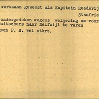 Achterkant bijzonderheden: ondergedoken wegens weigering om voor de Duitschers naar Delfzijl te varen - Achterkant beroep: kapitein - Achterkant naam werkgever: Reederij Stanfries