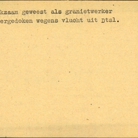 Achterkant bijzonderheden: ondergedoken wegens vlucht uit Dtsl. - Achterkant beroep: werkzaam geweest als granietwerker