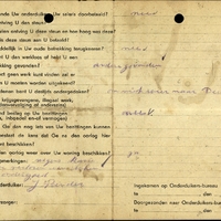 Bijzondere opmerkingen: Kerk: G.G. - - P.B.: afgenomen/O.T. Assen (Port Natal) - In bezit van een oude en nieuwe stamkaart: twee dagen voor de bevrijding terug ontvangen. - Kostwinner. Geen salaris ontvangen. Kan niet terug naar oude betrekking, andere gevonden. - Geen beslag gelegd op bezittingen door de vijand. - wegens razia en vervoer verloren een deken en stel ondergoed.