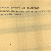 Achterkant bijzonderheden: Ondergedoken wegens weigering om te rijden voor de Wehrmacht - Duik-adres: G. Wienstra - Achterkant beroep: chauffeur