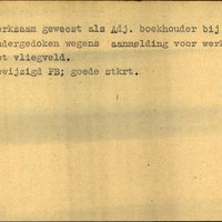 Achterkant bijzonderheden: Ondergedoken wegens aanmelding voor werken op het vliegveld. - Goede stkrt. - Achterkant beroep: Adj. boekhouder - Achterkant naam werkgever: PEB