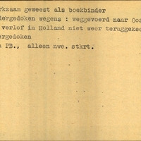 Achterkant bijzonderheden: Duik-adres: Pension Kijkstra - Ondergedoken wegens: weggevoerd naar Oostenrijk na verlof in Holland niet weer teruggekeerd en ondergedoken. - Alleen nwe. stkrt. - Achterkant beroep: Boekbinder - Achterkant naam werkgever: -