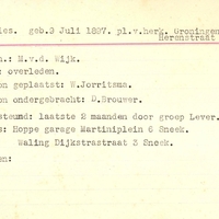 Bijzonderheden: Eerste onderduikadres; Hoppe garage Martiniplein 6 Sneek; tweede adres: Waling Dijkstrastraat 3 Sneek. Ouders overleden