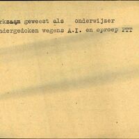 Achterkant bijzonderheden: ondergedoken wegens A.I. en oproep PTT - Achterkant beroep: Onderwijzer