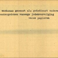 Achterkant bijzonderheden: Werkzaam geweest als godsdienst onderwijzer. - Ondergedoken vanwege Jodenvervolging. - Valse papieren. - Achterkant beroep: Godsdienst onderwijzer - Achterkant naam werkgever: -