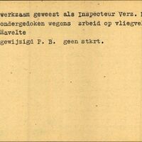 Achterkant bijzonderheden: ondergedoken wegens arbeid op vliegveld Havelte - gewijzigd P.B. geen stkrt. - Werkzaam geweest als Inspecteur Verz. My. - Ondergedoken wegens arbeid op vliegveld Havelte. - Gewijzigd P.B. geen stkrt. - Achterkant beroep: Inspecteur Verz. My.